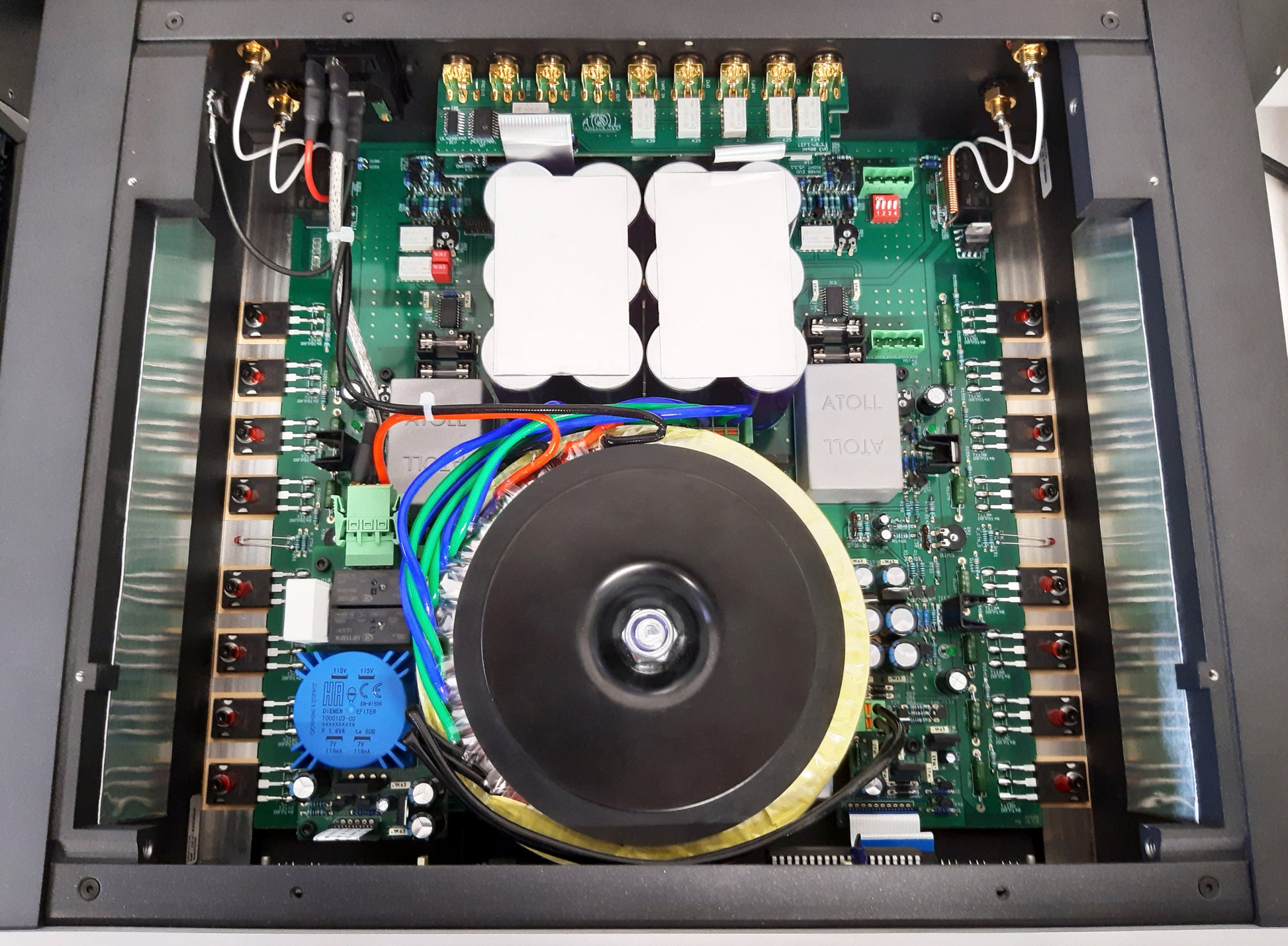 Der aufwendige Doppel-Mono-Aufbau garantiert eine exzellente Kanaltrennung. Diskret aufgebaute, symmetrische Ein- und Ausgangsstufen prägen den charakteristischen Atoll-Klang, während ein leistungsstarker Ringkerntransformator mit über 1 kVA die Endstufe souverän mit Energie versorgt. Die Verstärkung sowie sämtliche Funktionen des IN400 lassen sich komfortabel über die mitgelieferte IR-Fernbedienung steuern.