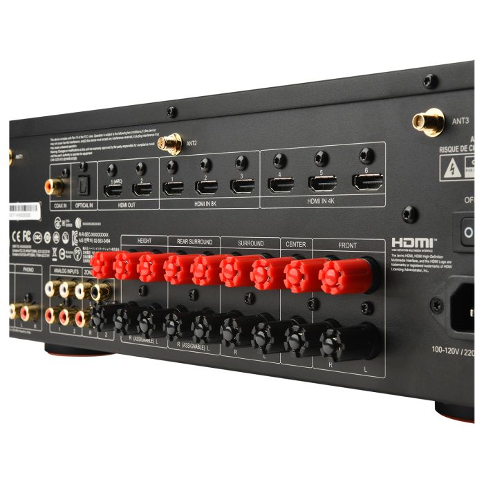 Hinsichtlich der Konnektivität bietet der MA9100HP insgesamt sechs HDMI-Eingänge und zwei HDMI-Ausgänge. WLAN (2.4 / 5GHz) und Bluetooth 5.3 (Low Energy, APTX HD, APTX Adaptive) ermöglichen vielseitiges kabelloses Streaming, sowohl Empfang als auch Übertragung. Weiterhin sind ein koaxialer und ein optischer digitaler Audioeingang sowie zwei einzelne Cinch-Stereo-Analogeingänge vorhanden. Für flexible Systemerweiterungen stehen Pre-Outs für Stereo Zone 2 sowie zwei Subwoofer (Subwoofer 1 und Subwoofer 2) zur Verfügung.