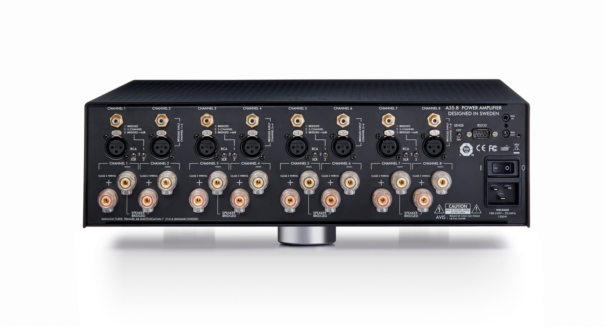 Jeder Kanal verfügt über XLR- und RCA-Eingänge und liefert 150 Watt pro Kanal an 8 Ohm, mit einer maximalen Ausgangsleistung von 1500 Watt. Jedes Paar Ausgangskanäle kann überbrückt werden, sodass der Verstärker praktisch jede Mehrkanal-Lautsprecherkonfiguration antreiben kann – entweder allein oder in Kombination mit einem A35.2 Stereoverstärker.