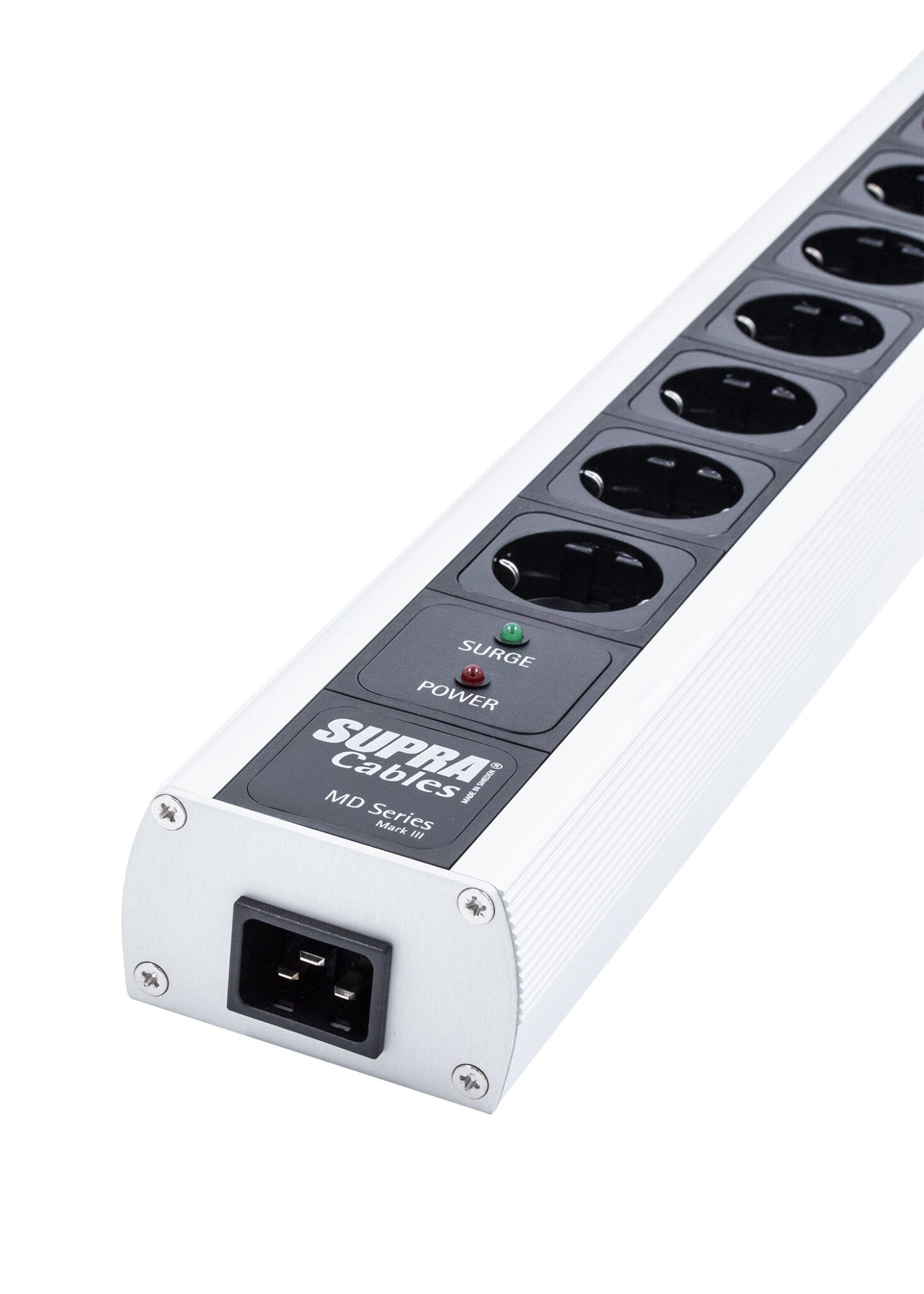 Das Aluminiumgehäuse bietet eine abgeschirmte, niederabstrahlende Umgebung, die interne Störungen ableitet und externe HF-Felder blockiert. Für maximale Störunterdrückung und stabile Stromversorgung sollte die Netzleiste an einer geerdeten Wandsteckdose betrieben und mit Supra LoRad-Netzkabeln verbunden werden.